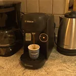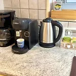 Meals can be prepared in an equipped kitchenette complete with a kettle and a dishwasher.